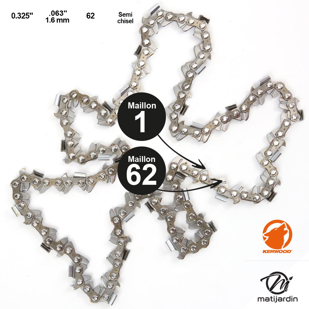 Chaîne Kerwood pour .325" 1,6 mm. 62 maillons. Gouge demi carré