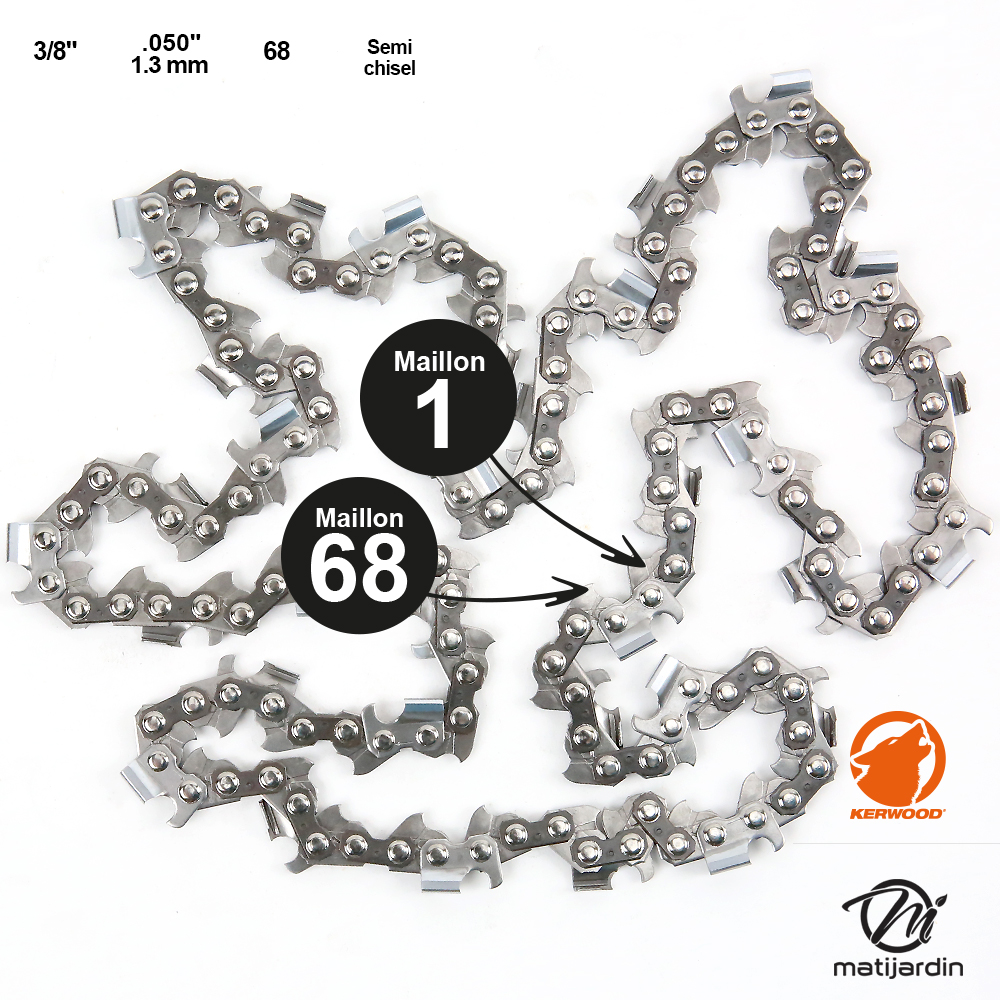Chaîne 68 entraineurs (maillons) epaisseur de 1,3mm en pas de 3/8" de marque Kerwood, pour tronçonneuse thermique et électrique