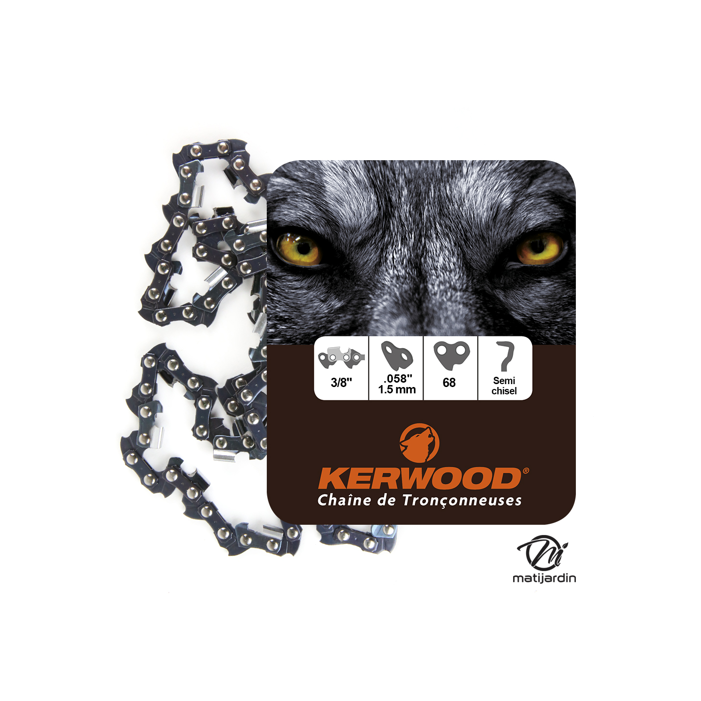 Chaîne Kerwood pour tronçonneuse 3/8" 1,5 mm. 68 maillons. Gouge profil demi carré