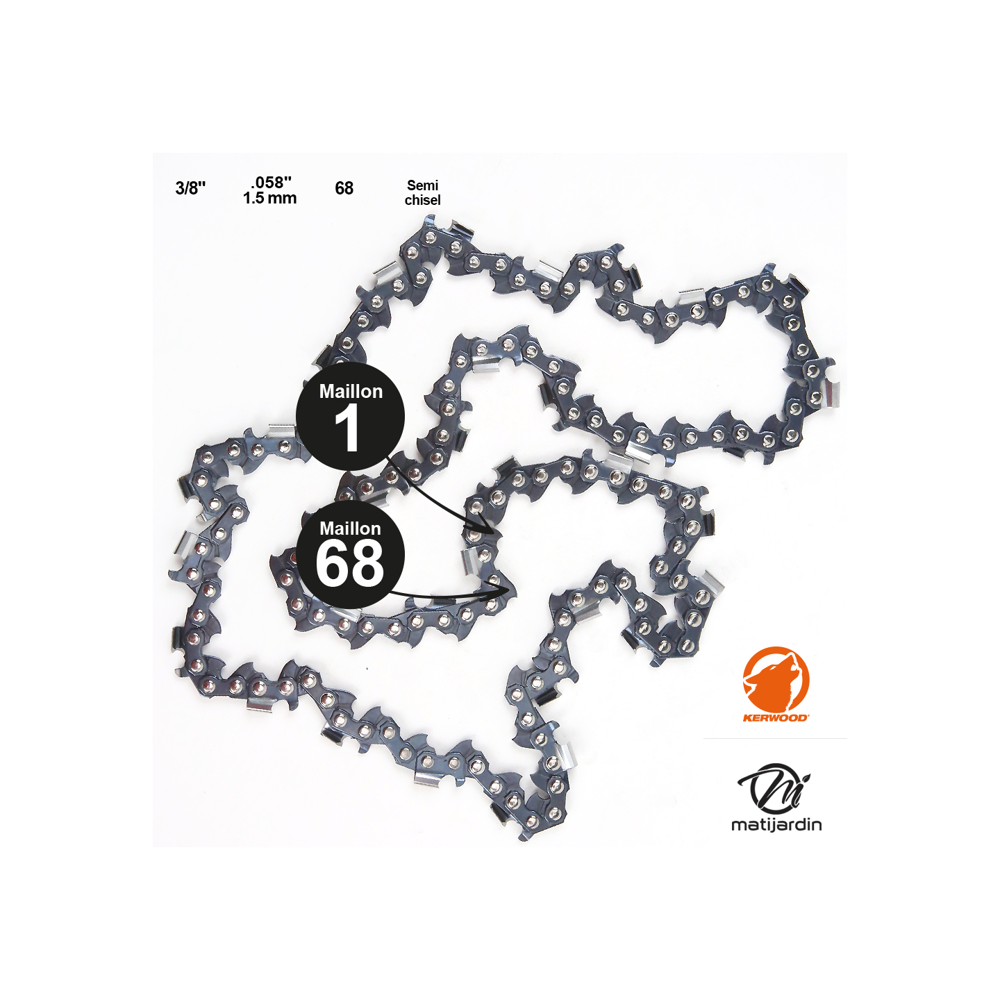 Chaîne 68 entraineurs (maillons) epaisseur de 1,5mm en pas de 3/8" de marque Kerwood, pour tronçonneuse thermique et électrique