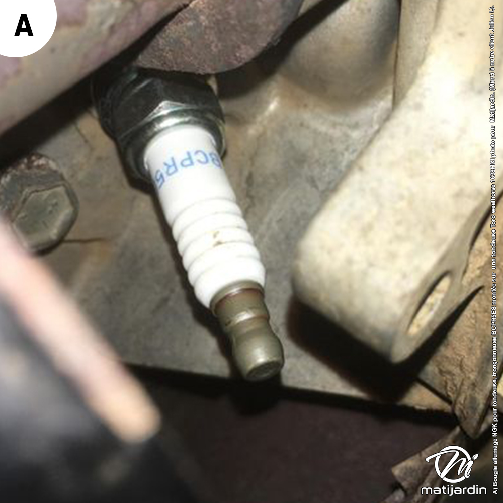 A) : Bougie allumage NGK pour tondeuse, tronçonneuse BCPR5ES montée sur  une tondeuse Toro weelhorse 1638HXl photo pour  Matijardin. (Merci à notre client Julien L).