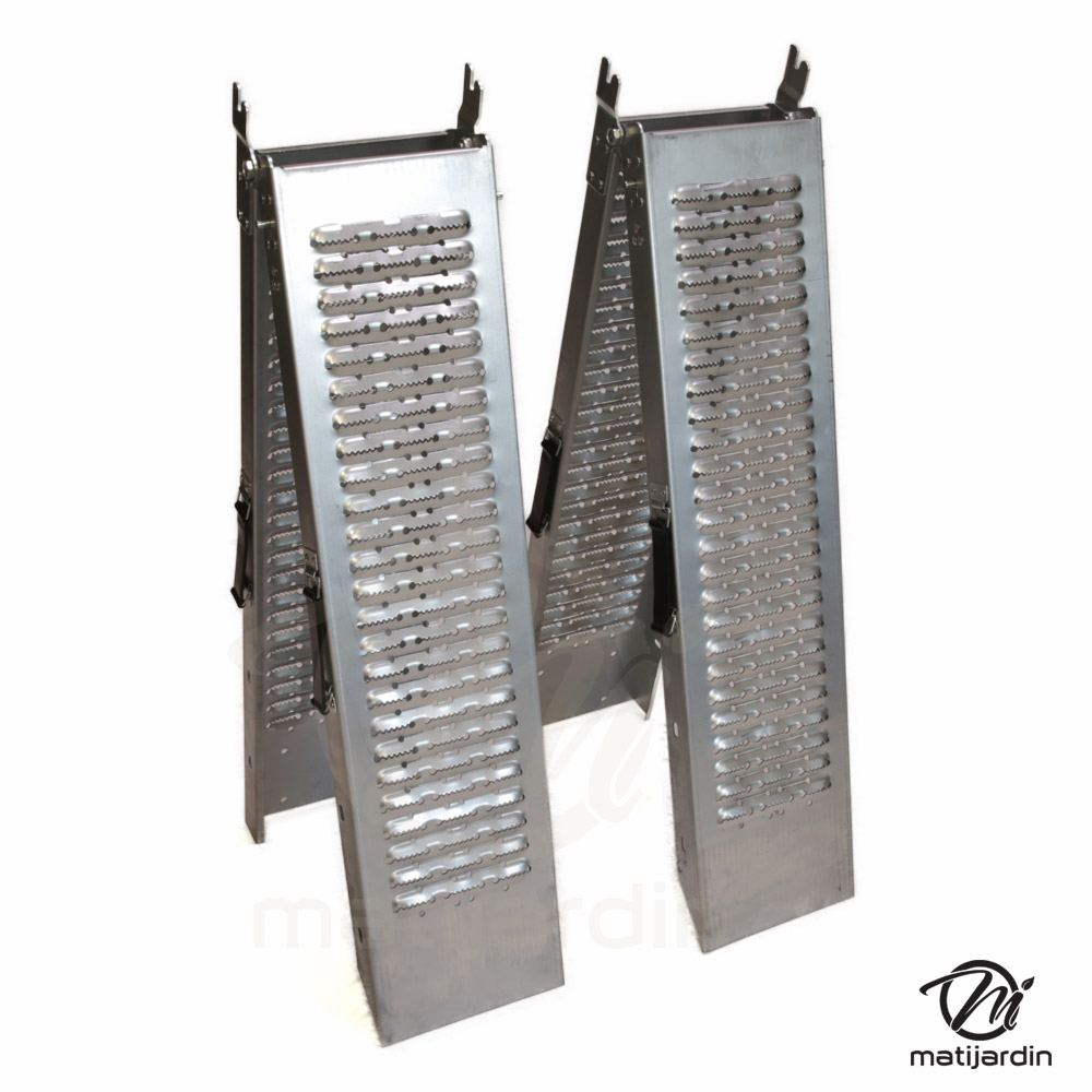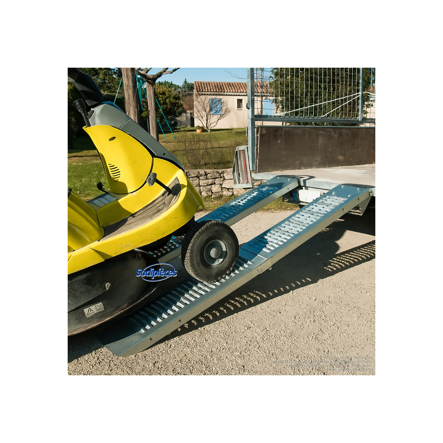 Simplifiez le transport de vos équipements avec cette paire de rampes pliantes ultra-pratiques. Conçues pour résister aux charges lourdes (jusqu'à 200 kg chacune), elles s'adaptent parfaitement aux besoins des particuliers passionnés de jardinage et de bricolage. Gain de place garanti : se replient en deux pour un encombrement réduit de moitié. Un système de fixation complet avec plateaux d'ancrage et visserie vous assure une stabilité totale pendant le chargement.
