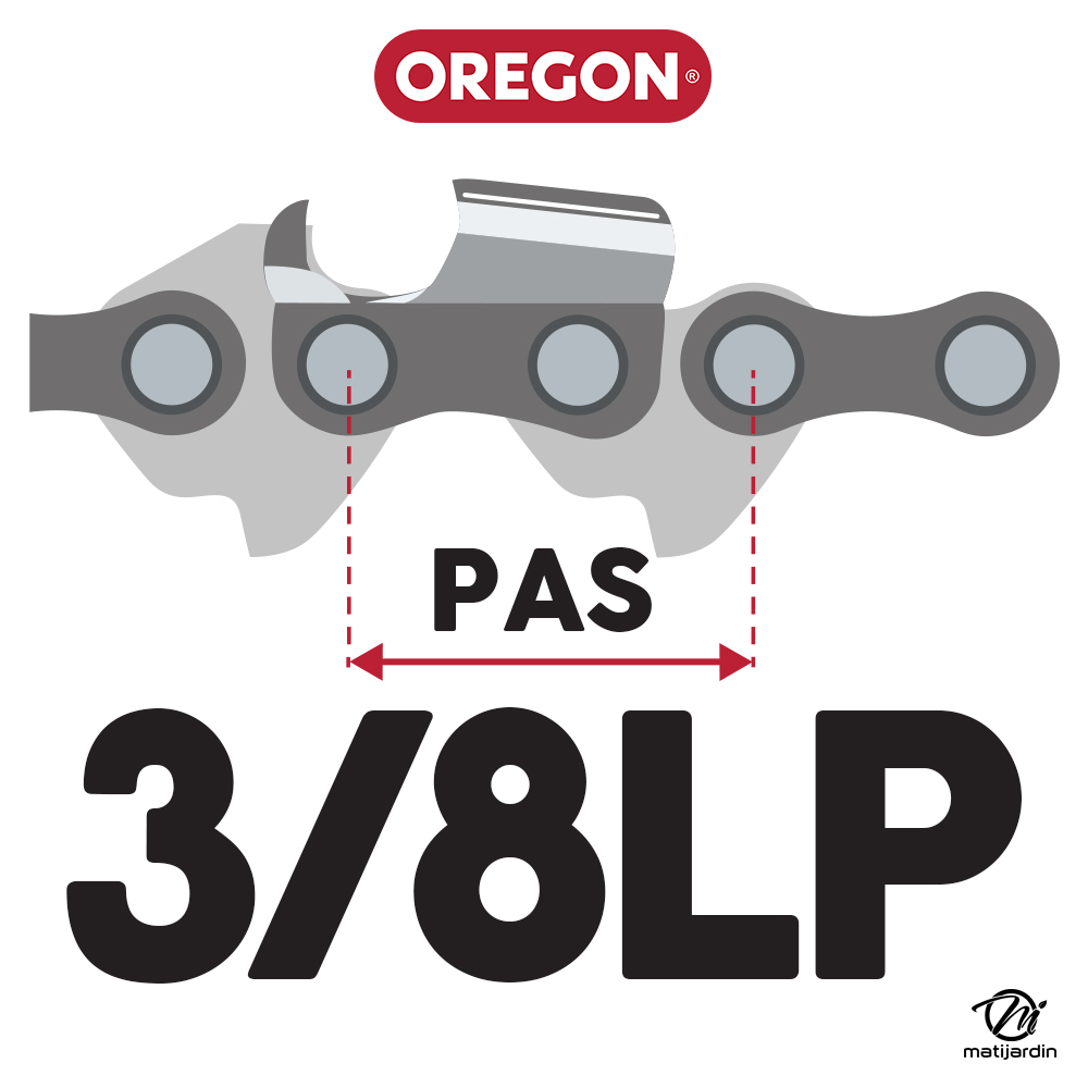 Chaîne Oregon pour tronçonneuse 3/8" Lp 1,6 mm. Rouleau 100 pieds. Gouge profil demi rond