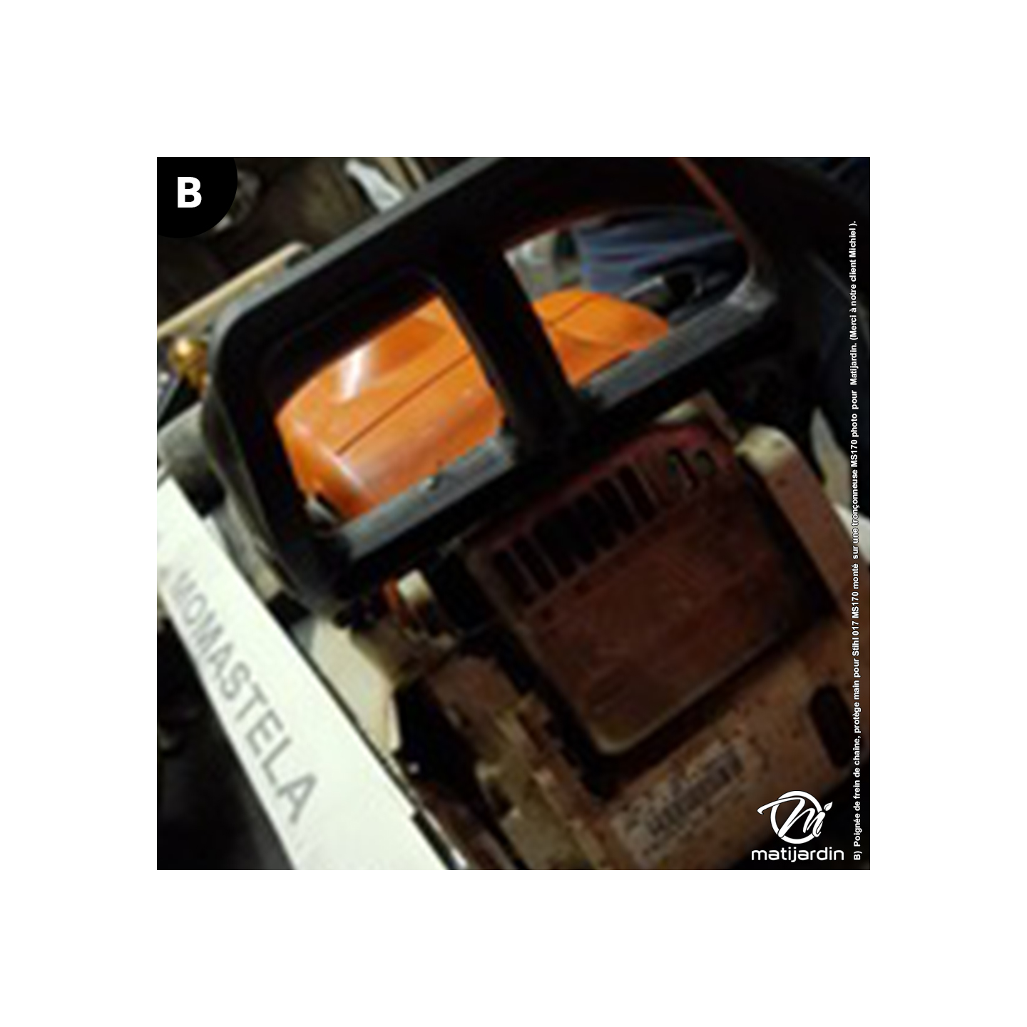 B) Poignée de frein de chaîne, protège main pour Stihl 017 MS170 monté sur une tronçonneuse MS170 photo pour Matijardin. (Merci à notre client Michiel ).