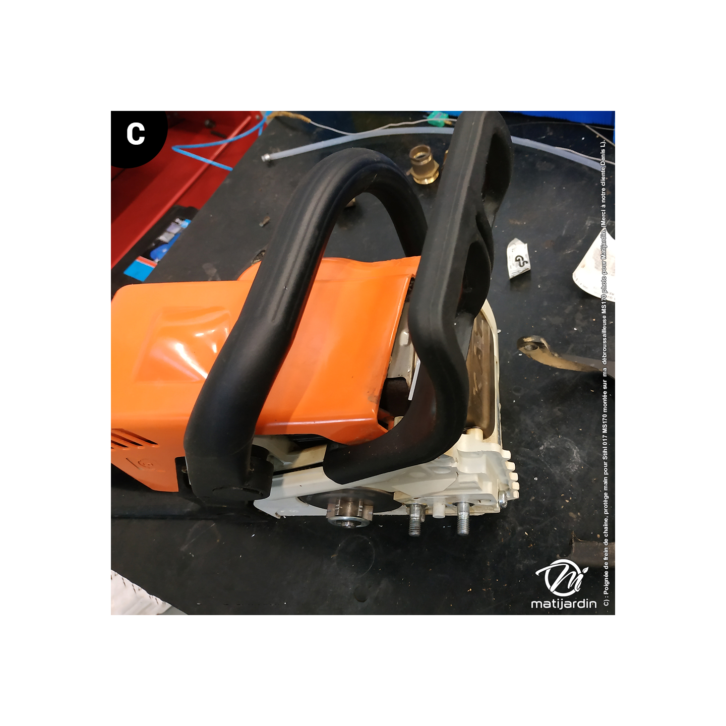 C) : Poignée de frein de chaîne, protège main pour Stihl 017 MS170 montée sur ma débroussailleuse MS170 photo pour Matijardin. (Merci à notre cliente Denis L).