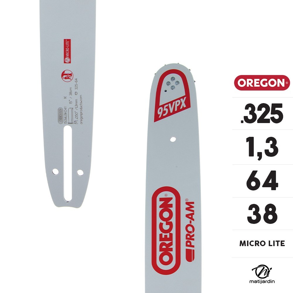 A) : Guide tronçonneuse Oregon 38 cm. .325" 1,3 mm 64 maillons 150MLBK041 Micro Lite + Chaîne Oregon pour tronçonneuse 3/8" 1,3 mm. 64 maillons. Gouge profil carré. Super 70 cm montée Echo Kiorizt photo pour Matijardin. (Merci à notre client L pierre.)