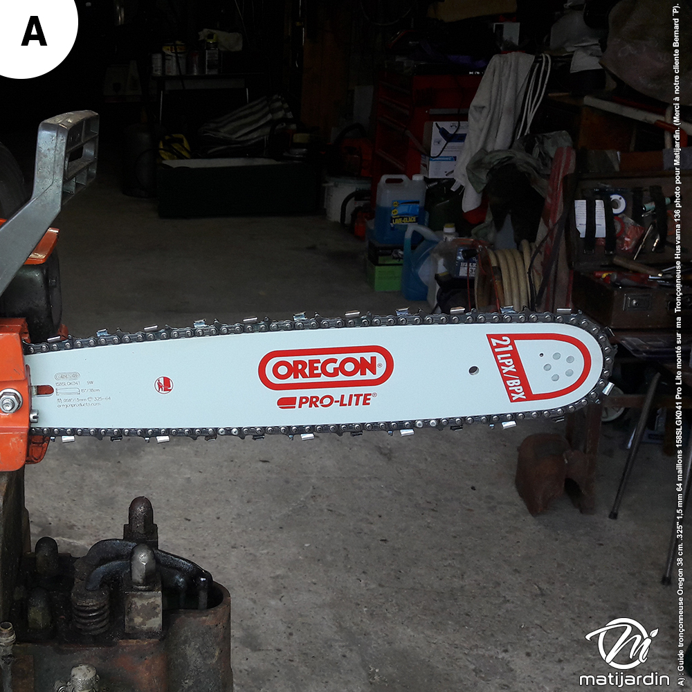 A) : Guide tronçonneuse Oregon 38 cm. .325" 1,5 mm 64 maillons 158SLGK041 Pro Lite monté sur ma Tronçonneuse Husvarna 136 photo pour Matijardin. (Merci à notre cliente Bernard P).