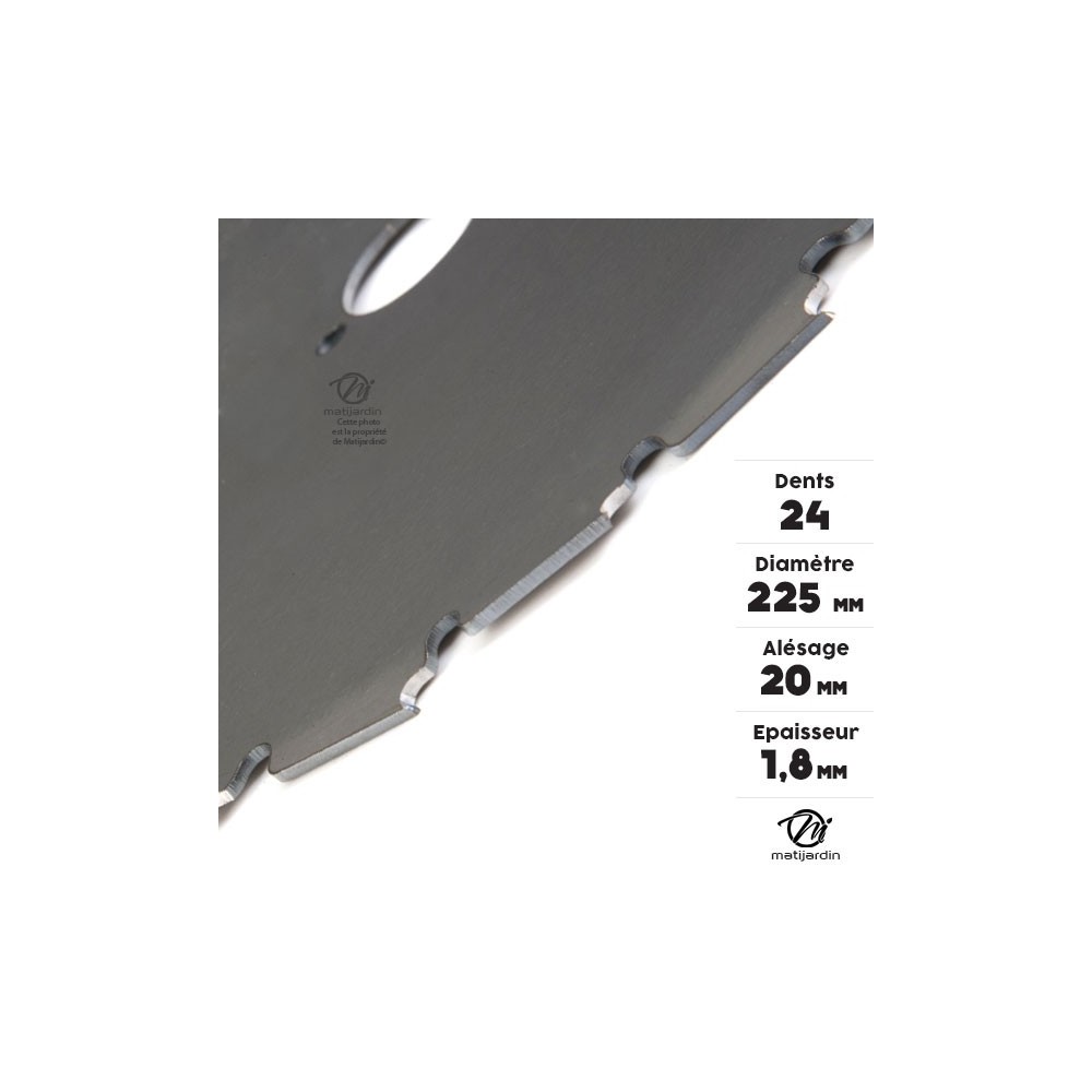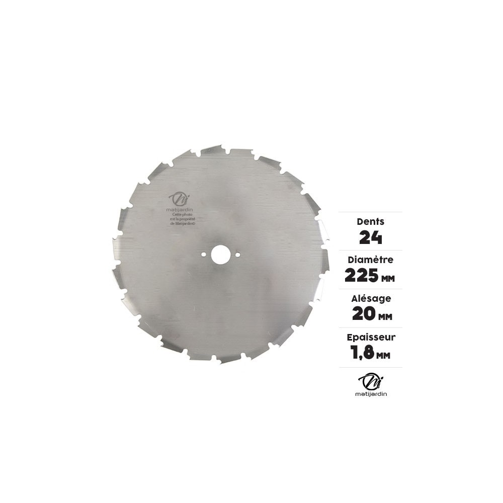Lame disque 24 dents débroussailleuse. Gouges dentés. Ø 225 mm. Alésage 20 mm. Epaisseur 1,8 mm