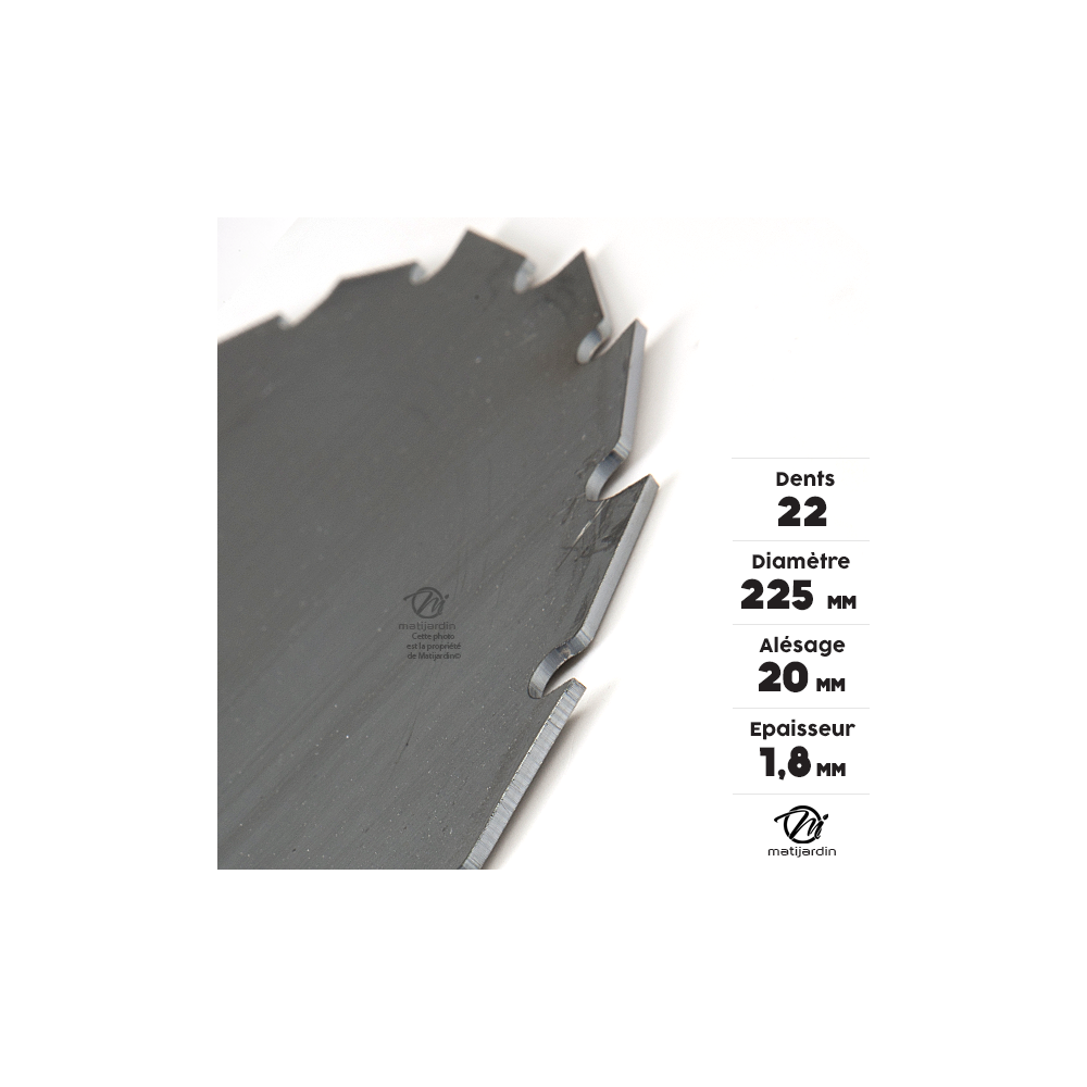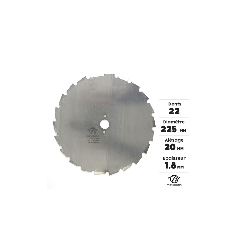 Lame disque 22 dents débroussailleuse. Gouges. Ø 225 mm. Alésage 20 mm. Epaisseur 1,8 mm