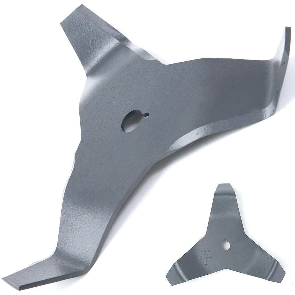 - La lame recourbée (Spéciale ronces) : Grâce à ses extrémités repliées, elle permet un travail de broyage exceptionnel. En exerçant un mouvement de haut en bas, vous "pulvérisez" les ronciers enchevêtrés, évitant ainsi que la végétation ne s'enroule autour de la tête de votre débroussailleuse.