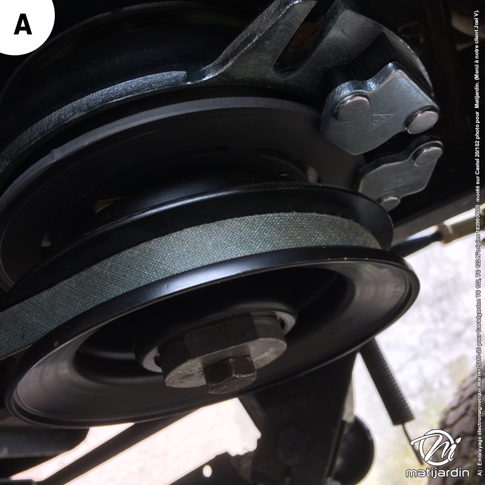 A) : Embrayage électromagnétique Warner 5217-20 pour Castelgarden TC 102, TC 122 N°origine 18399060/0 monté sur Castel 20/102 photo pour Matijardin. (Merci à notre client Joel V)