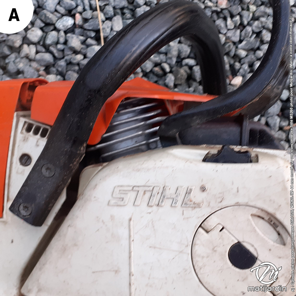 A) : Cylindre piston pour tronçonneuse Stihl 026, MS260. Ø 44 mm monté sur une tronçonneuse Stihl MS260 photo pour Matijardin. (Merci à notre client Renaud J).