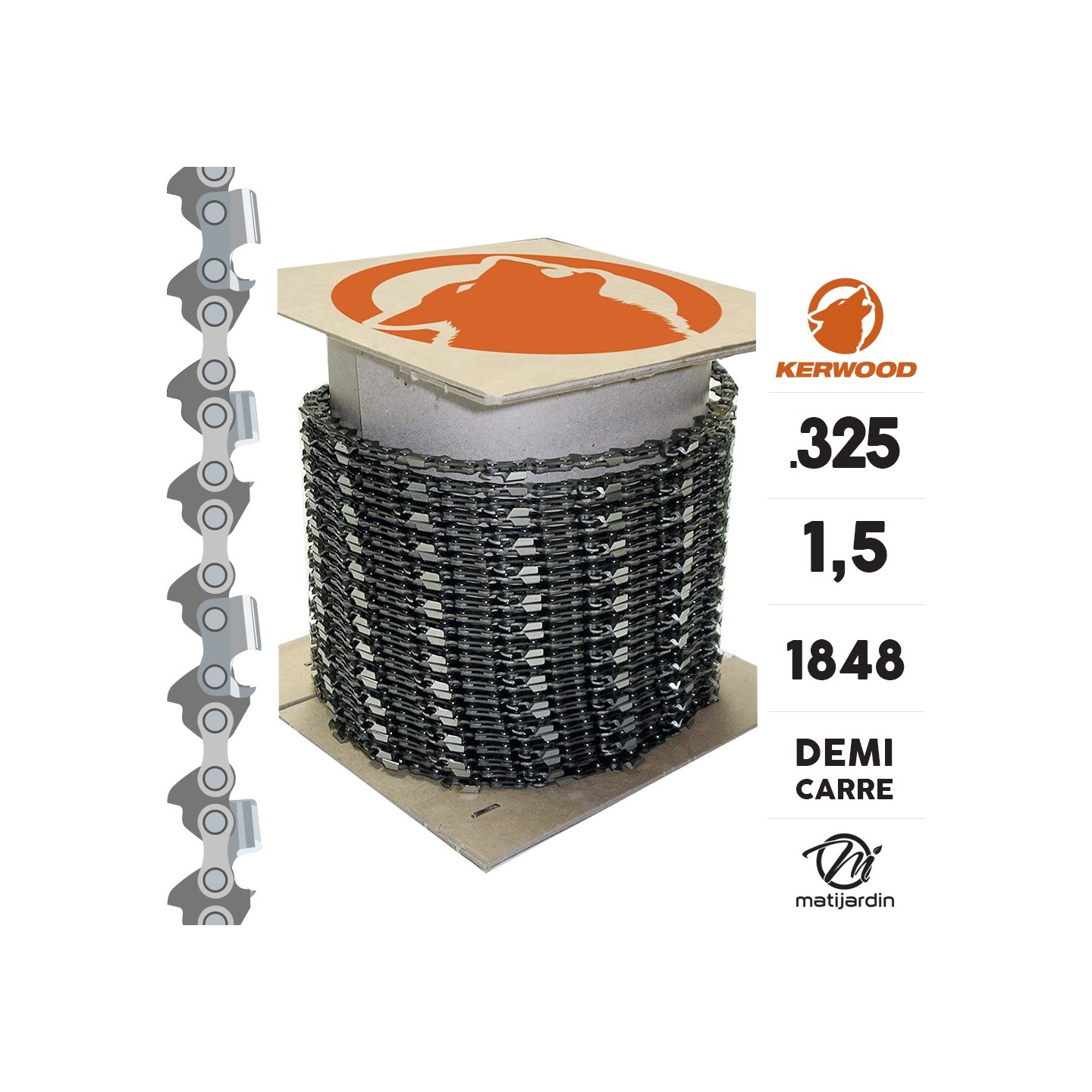 Chaîne Kerwood pour tronçonneuse .325" 1,5 mm. Rouleau 100 pieds. Gouge profil demi carré