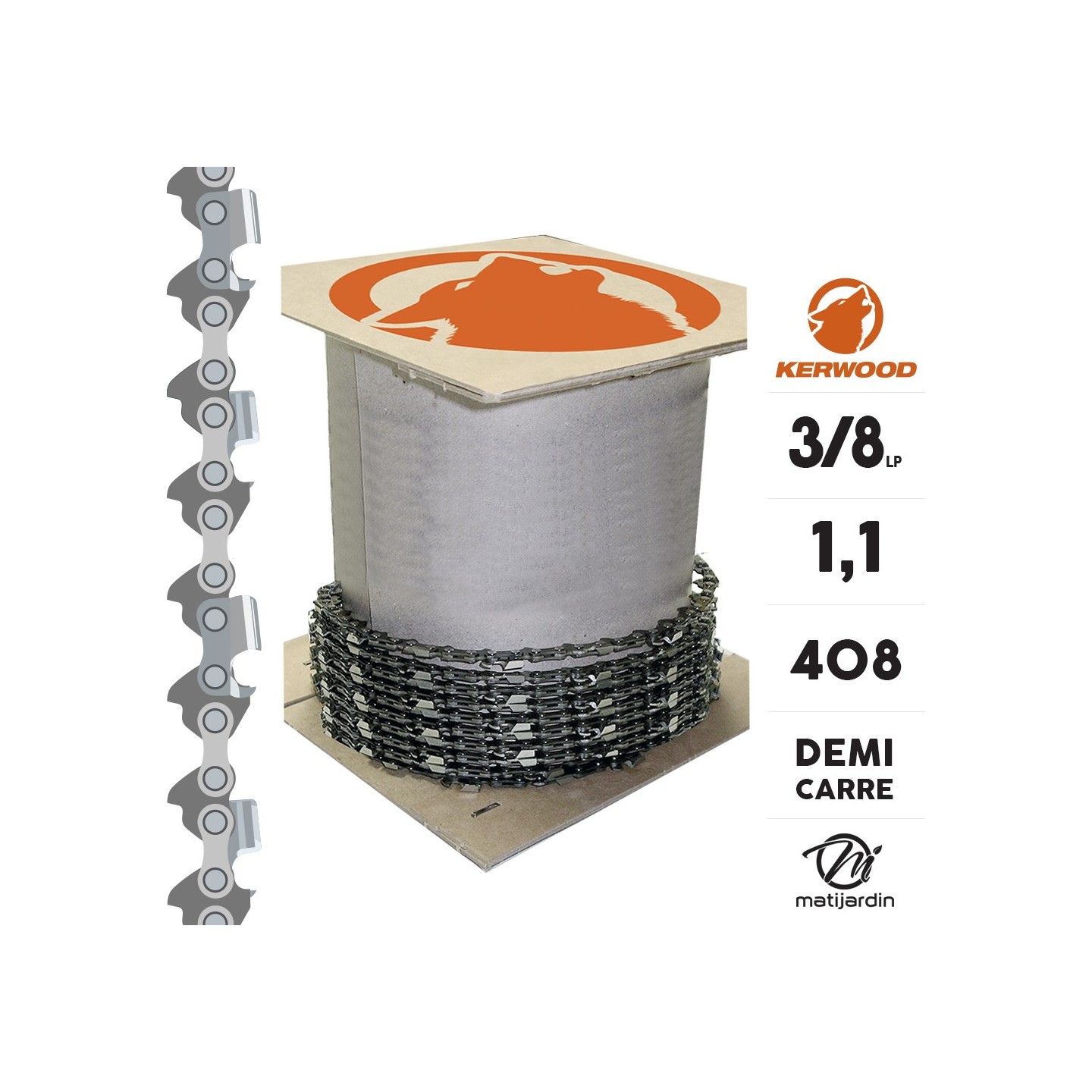 Chaîne Kerwood pour tronçonneuse 3/8" 1,1 mm. Rouleau 25 pieds. Gouge profil demi carré