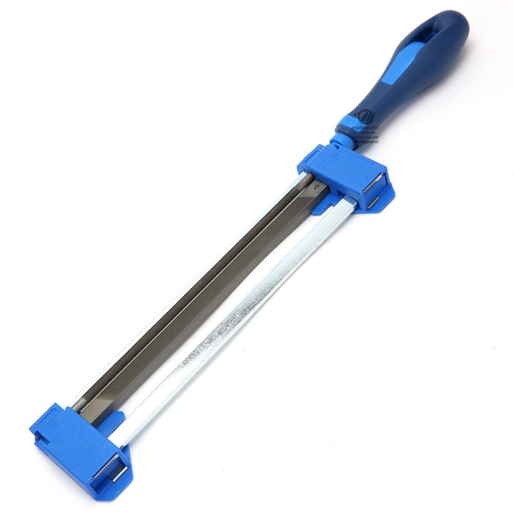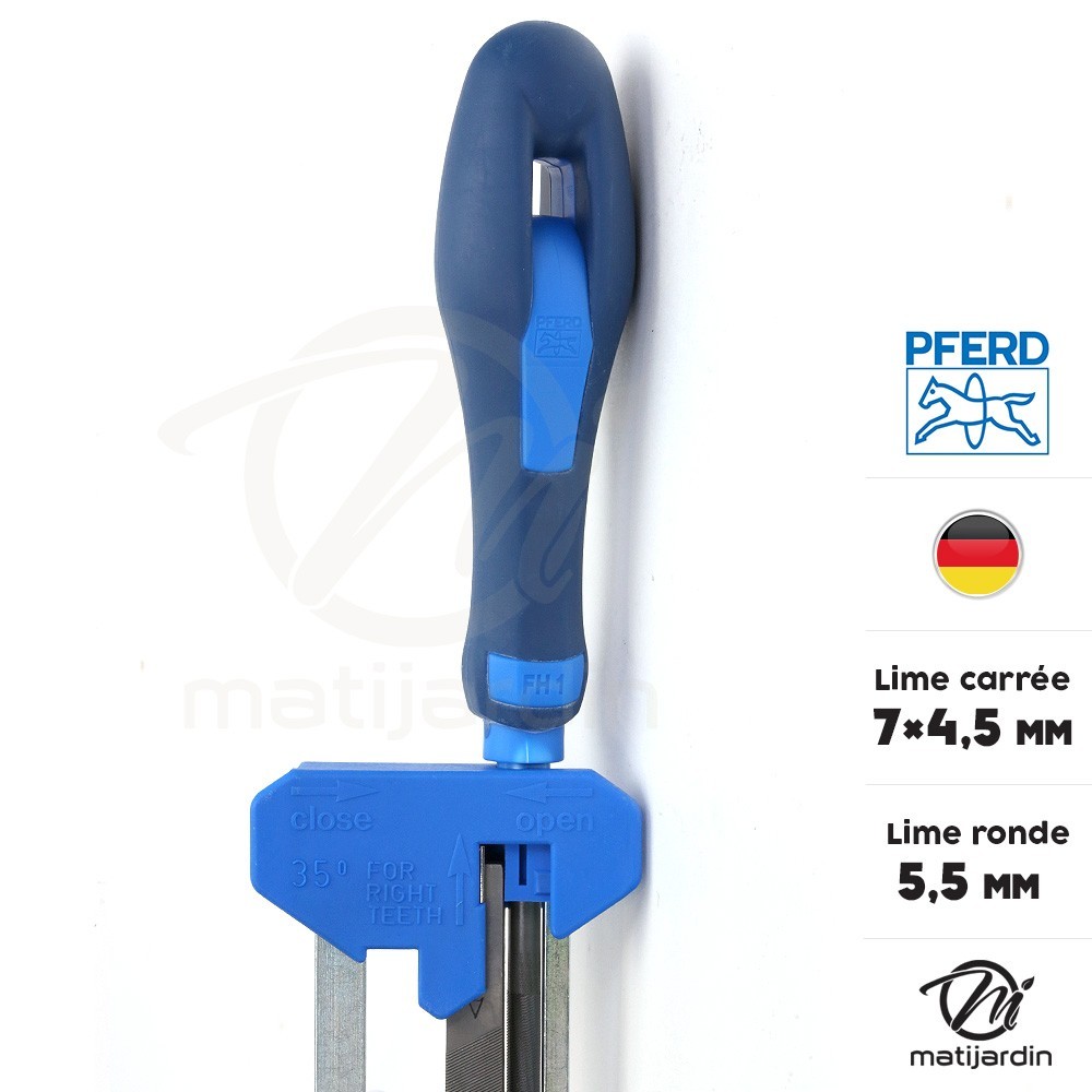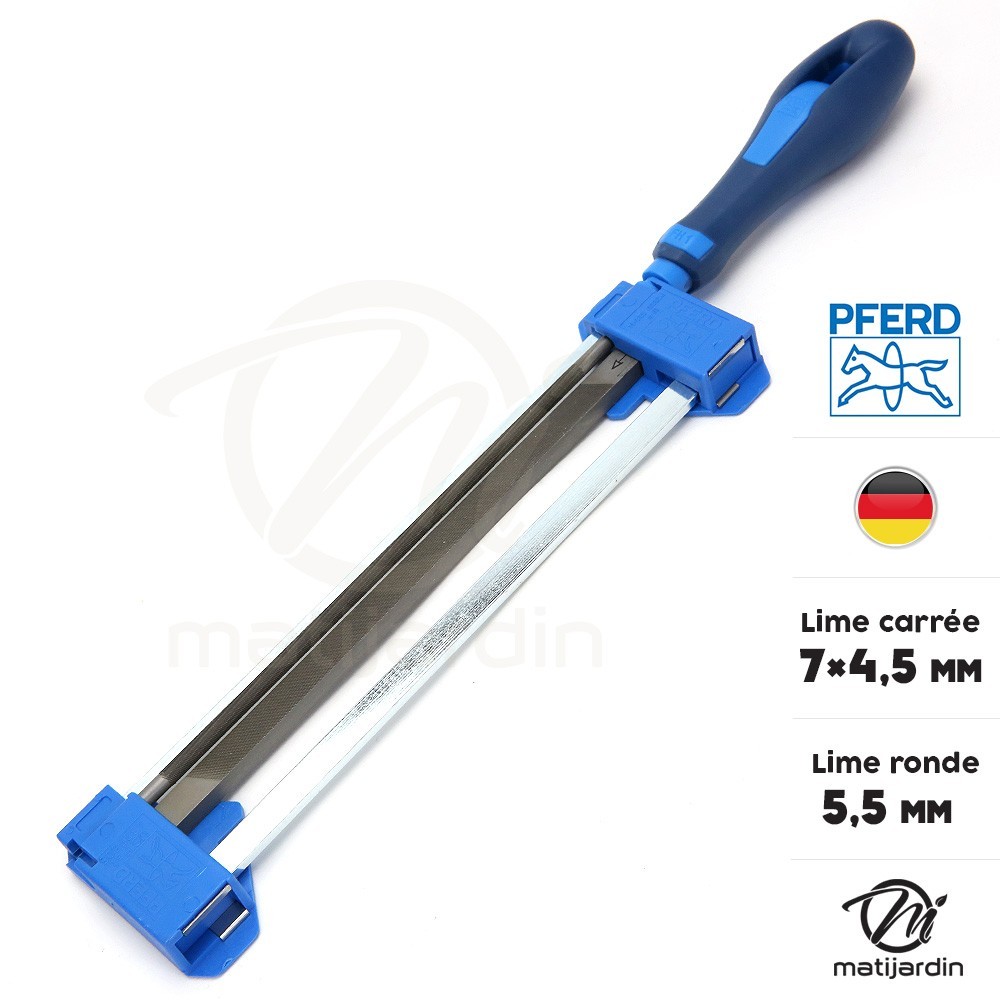 Lime ronde Ø 5,5 mm + lime carrée 7x4,5 mm. Porte lime d'affûtage Pferd
