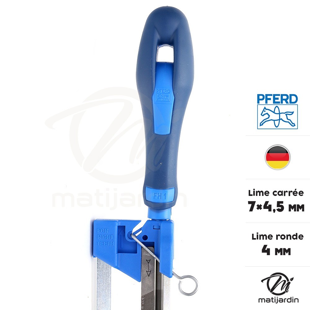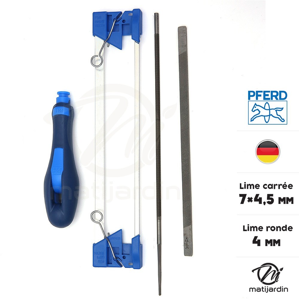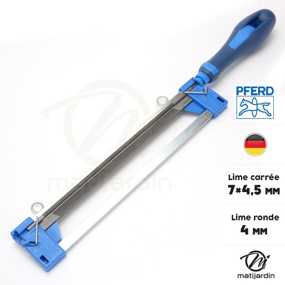 Lime ronde Ø 4 mm + lime carrée 7x4,5 mm. Porte lime d'affûtage Pferd