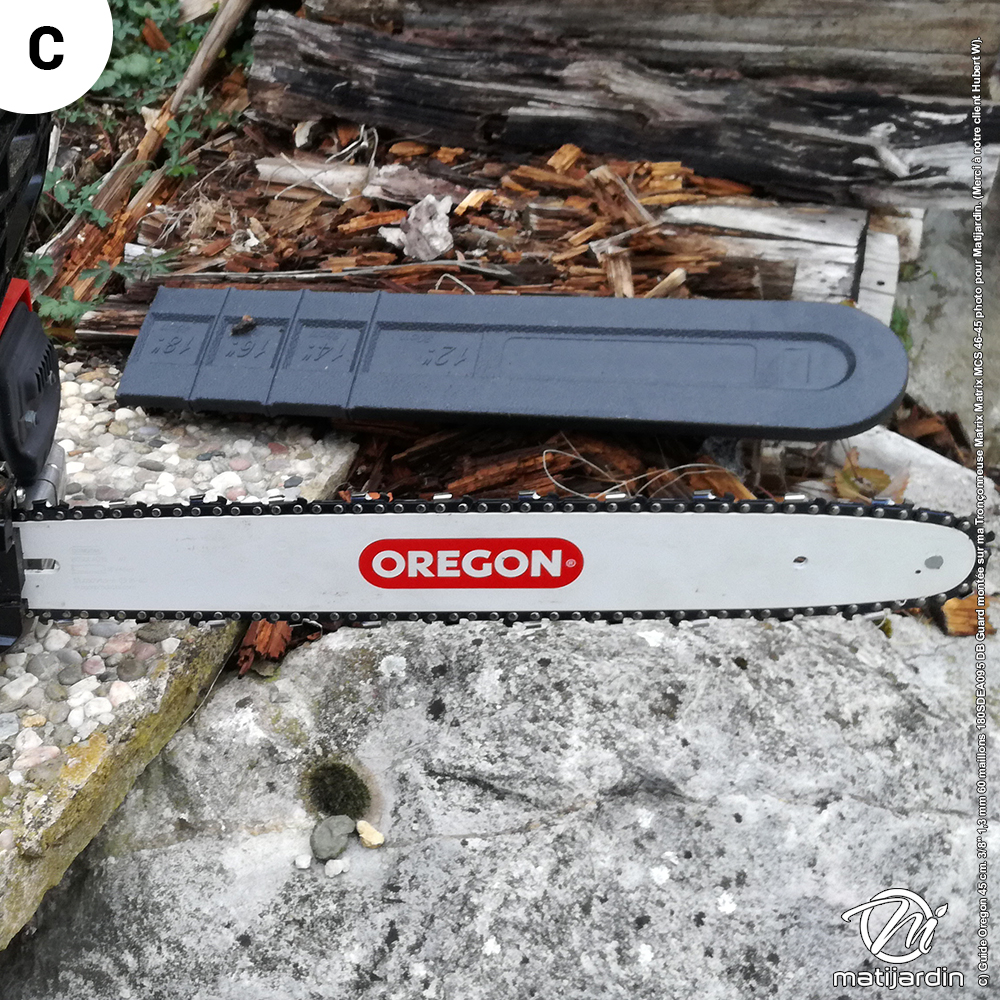 C) Guide Oregon 45 cm. 3/8LP" 1,3 mm 60 maillons 180SDEA095 DB Guard montée sur ma Tronçonneuse Matrix MCS 46-45 photo pour Matijardin. (Merci à notre client Hubert W).
