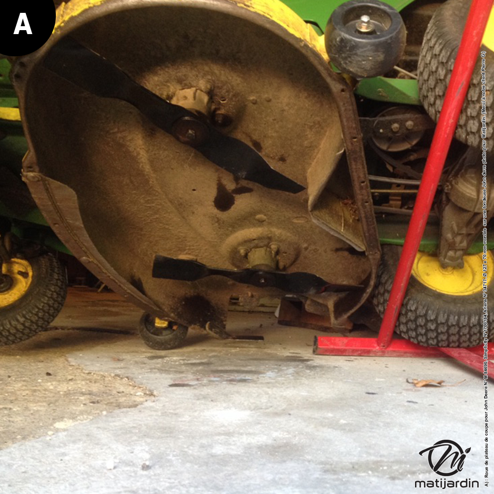 A) : Roue de plateau de coupe pour John Deere N° M 84690, Simplicity N°1700184, Ariens N° 34717. Ø 127 x 70 mm montée sur une tondeuse John derre photo pour Matijardin. (Merci à notre client Pierre G.)