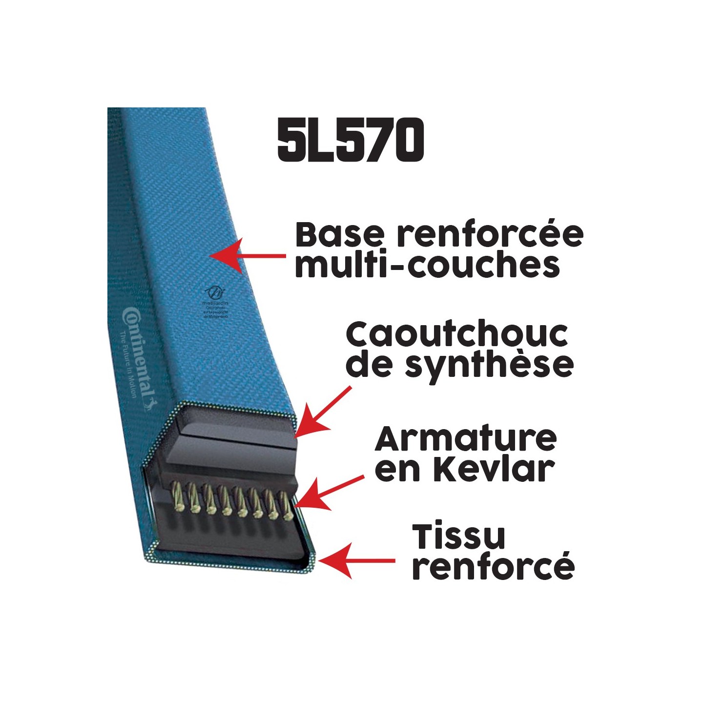 Courroie de marque Continental type 5L570 de taille 15,8 x 9,5 x 1448 mm en kevlar de forme trapézoïdale.