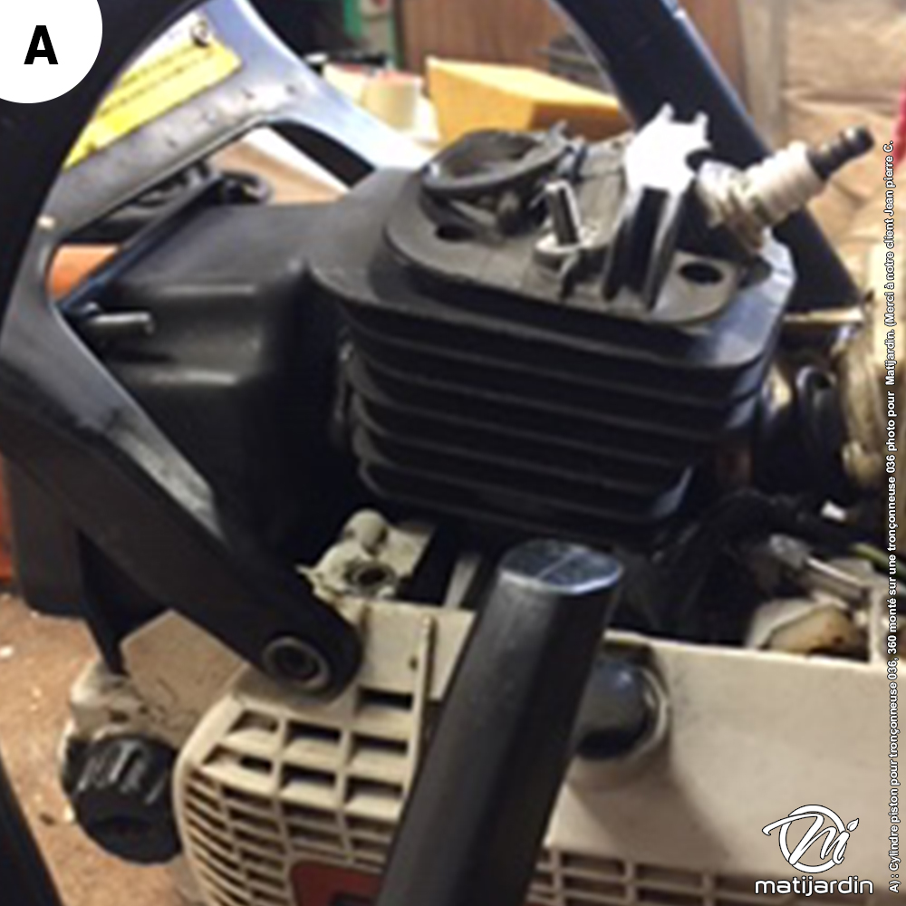 A) : Cylindre piston pour tronçonneuse 036, 360 monté sur une tronçonneuse 036 photo pour Matijardin. (Merci à notre client Jean pierre C).