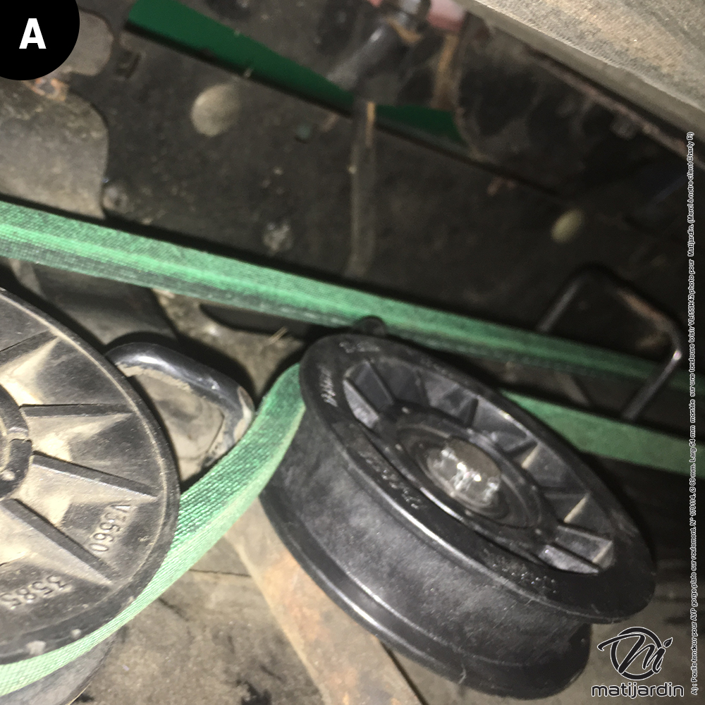 A) : Poulie tendeur pour AYP gorge plate sur roulement. N° 179114. Ø 89 mm. Larg 54 mm montée sur une tondeuse loisir VL155H42 photo pour Matijardin. (Merci à notre client Charly F.)