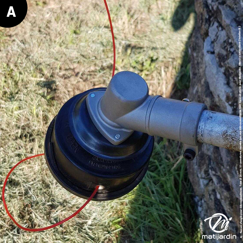 A) : Renvoi d'angle pour débroussailleuse. Tube Ø 28 mm. 11 cannelures. montée sur une débroussailleuse G4C Xenoah photo pour Matijardin. (Merci à notre client Christian B.)