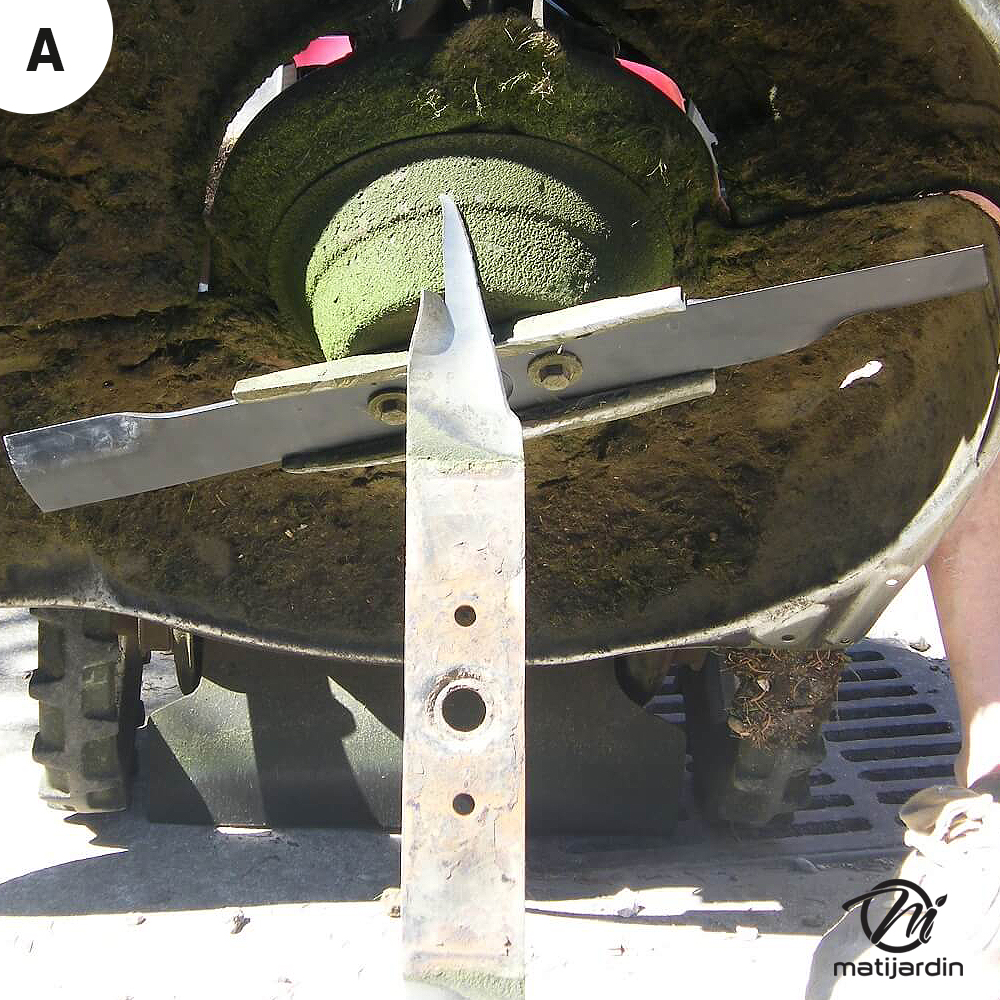 Astuce remontage. Au remontage, attention au sens de montage de la lame ! Pour la plupart des modèles de tondeuse, le côté plat du tranchant de la lame (illustration 2) doit se retrouver côté pelouse. Soyez vigilant, la partie coupante de votre lame peut vite vous envoyer aux urgences ! Matijardin vous conseille d’utiliser des gants.