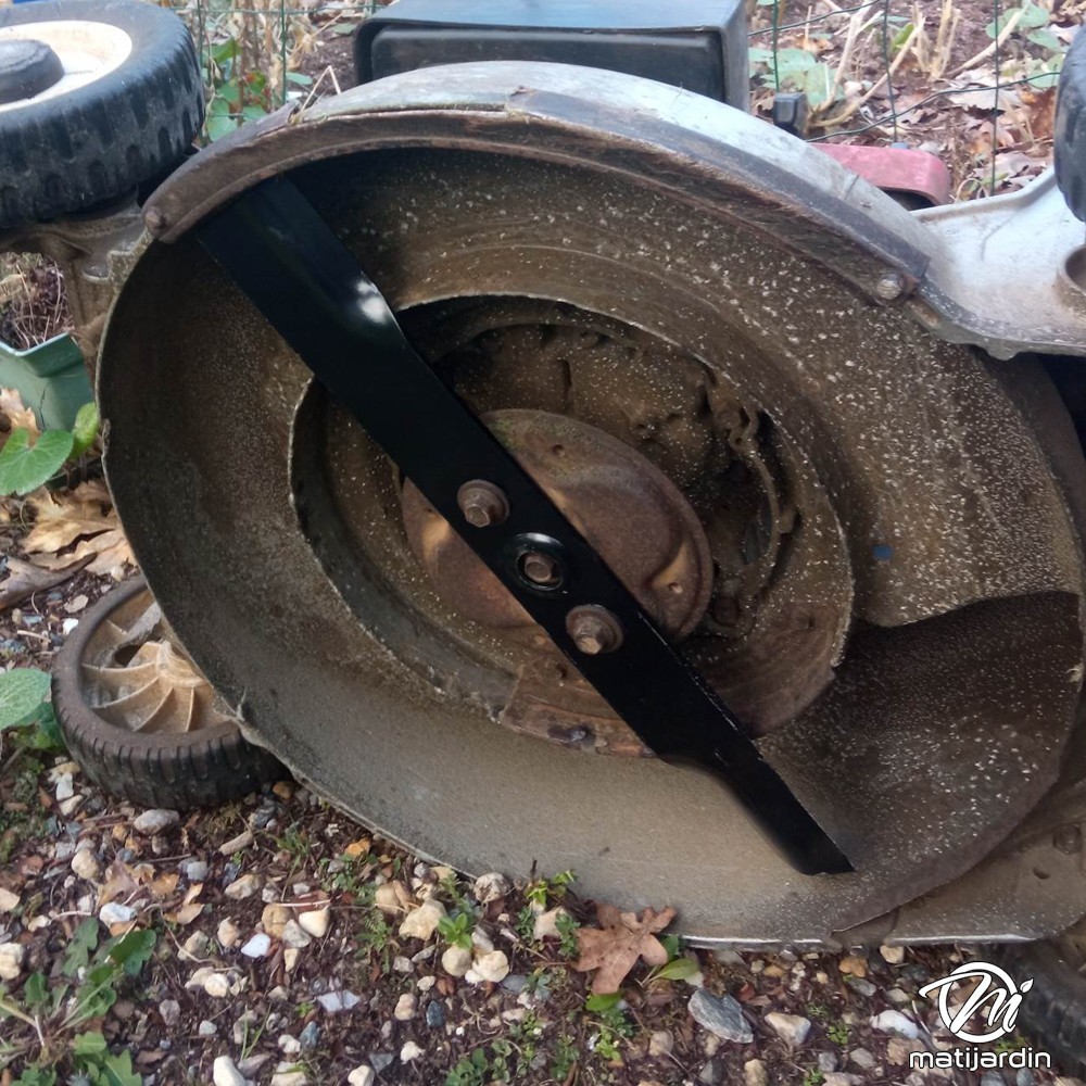 Astuce remontage. Au remontage, attention au sens de montage de la lame ! Pour la plupart des modèles de tondeuse, le côté plat du tranchant de la lame (illustration 2) doit se retrouver côté pelouse. Soyez vigilant, la partie coupante de votre lame peut vite vous envoyer aux urgences ! Matijardin vous conseille d’utiliser des gants.